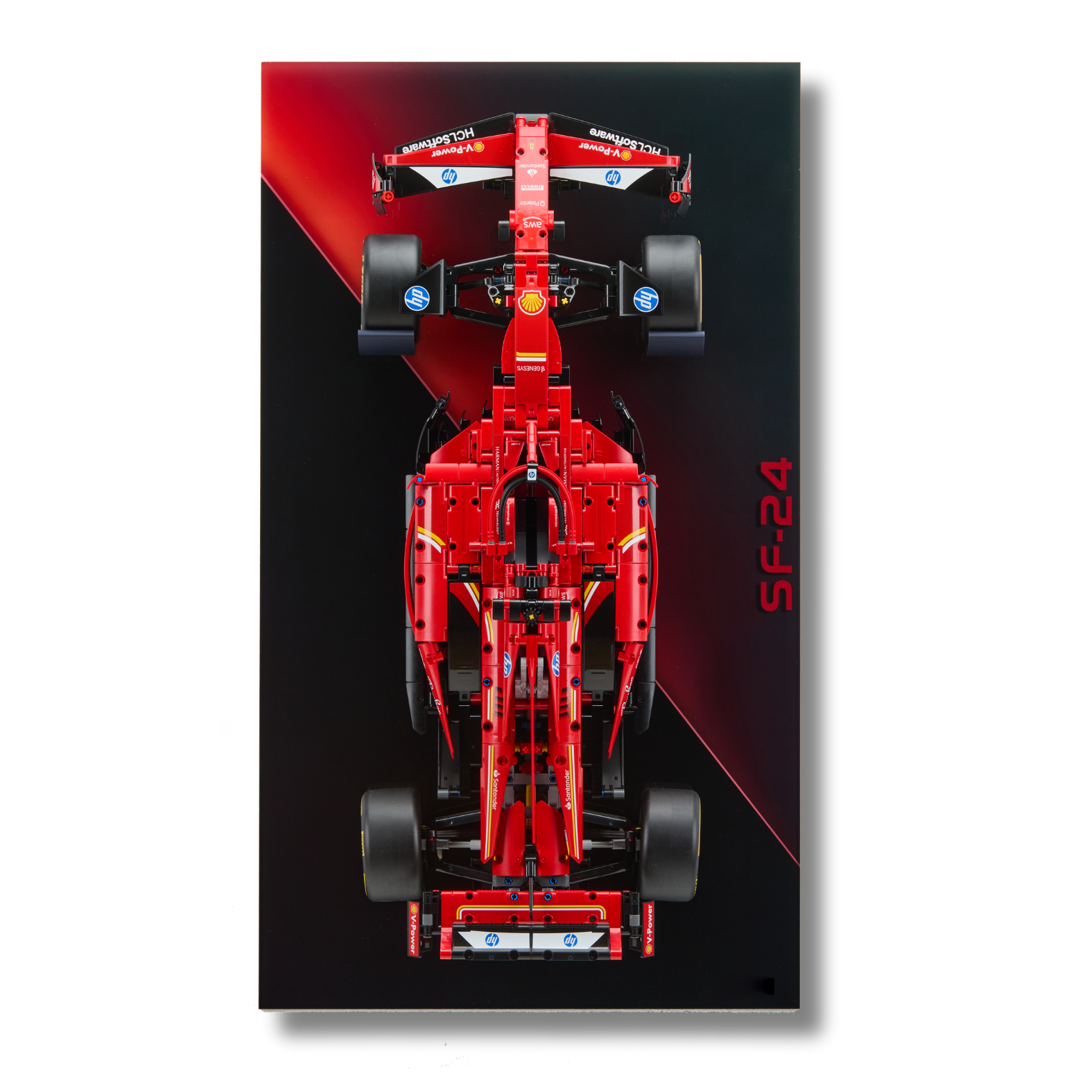Clever way to display these big F1 Technic builds. The color coordinated panels really set the car off.
