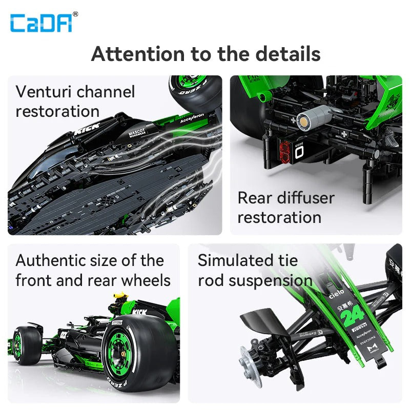 Choose Zhou #24 or Bottas #77 liveries—both included. Swap steering wheels, halos, and side panels bare-handed. Cockpit reveals micro fire extinguishers and hydraulic systems; display them as rivals or allies.