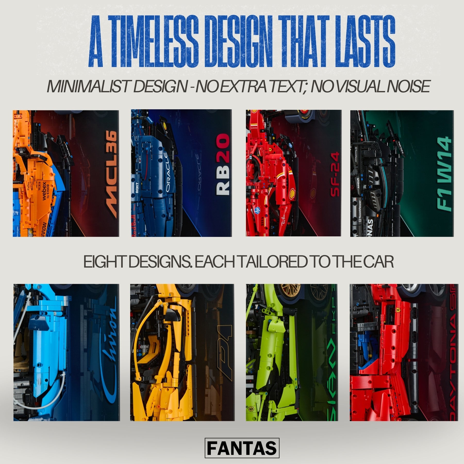 The display uses FantasMall’s signature tire-based mounting hook, engineered to securely support the LEGO car by the wheels — keeping it stable, protected, and visually floating.